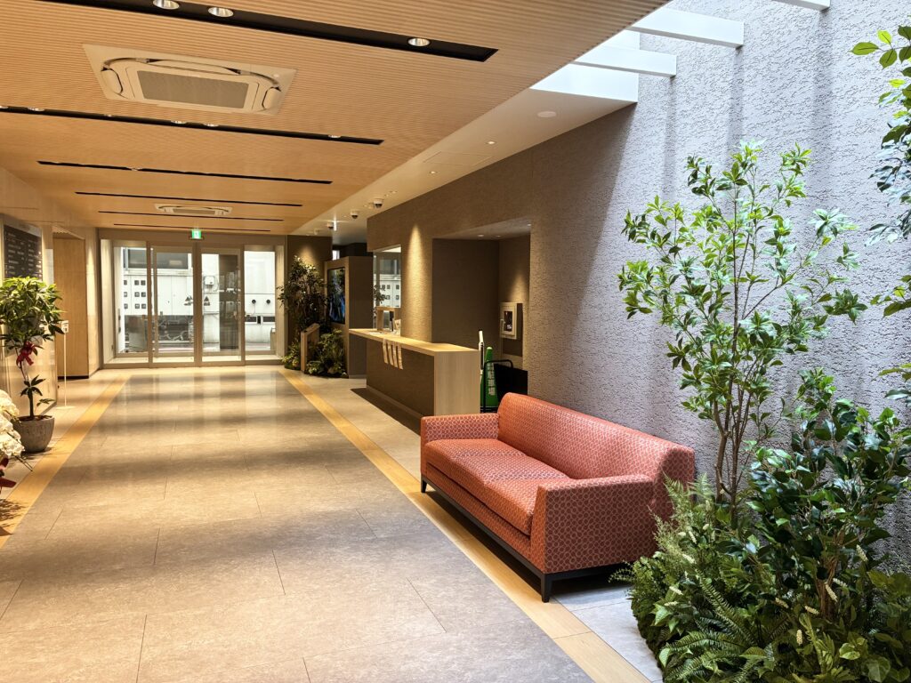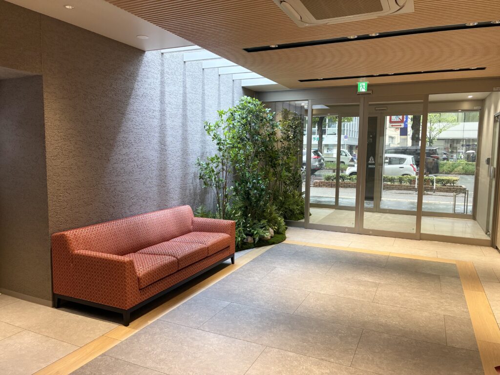 新しいエントランスは、グリーンを取り入れた落ち着きのある空間へと生まれ変わりました。