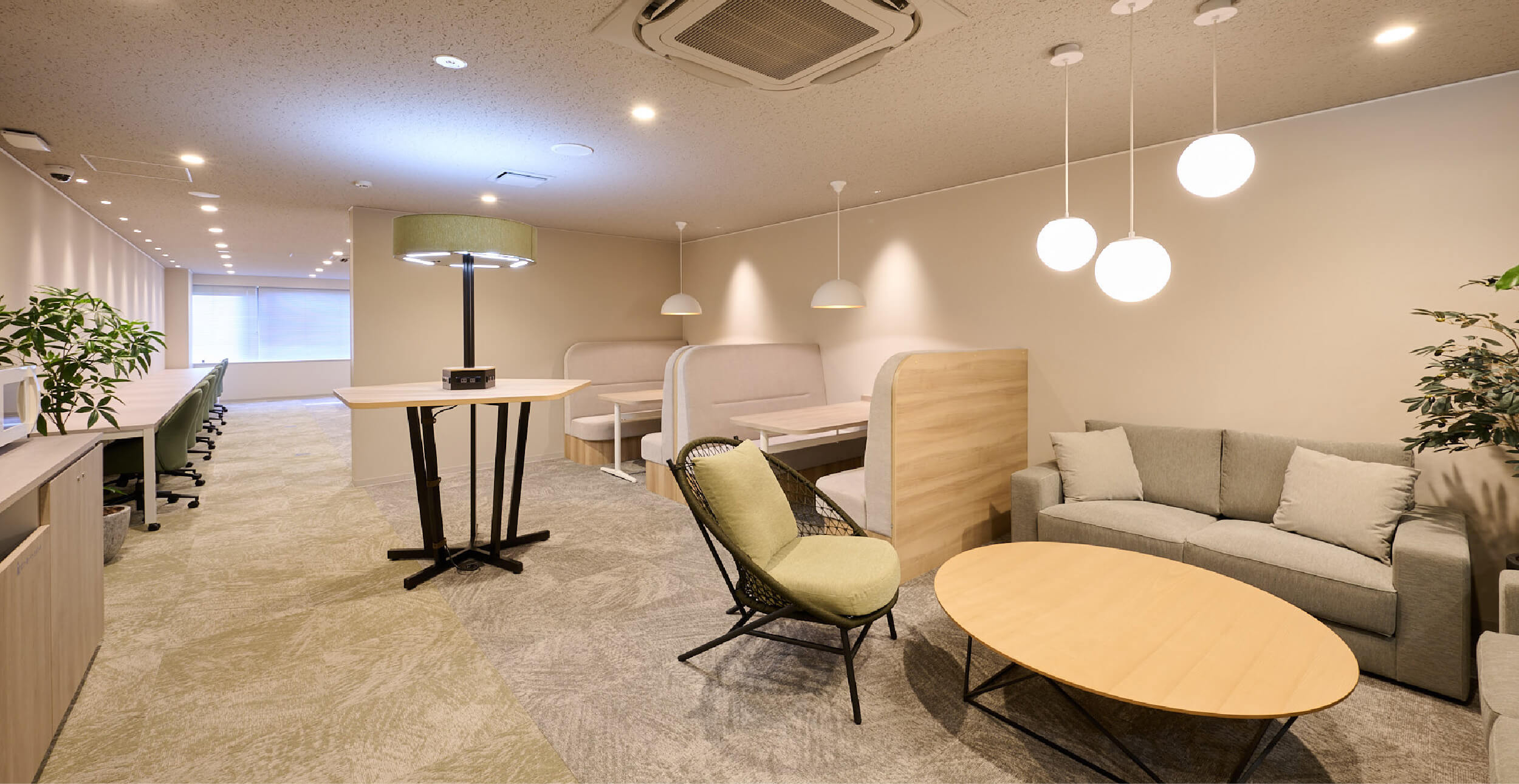 貸会議室と併用できるラウンジは、緑を基調とした内装デザインで、落ち着いた雰囲気を演出します。 ビジネスシーンの中で、ふとリラックスできる空間を設けることで、業務効率とモチベーションを最大化。 光回線完備で、設備も充実しています。